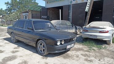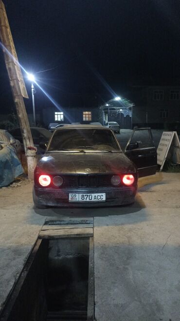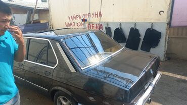 BMW 5‑Series седан (E28), черный цвет, правый и левый ряд дверей по 2, кузов седан. Классический дизайн с круглой оптикой спереди и сзади. Литые 5‑спицевые диски, тонированные стекла, хромированная окантовка окон. Задний привод.