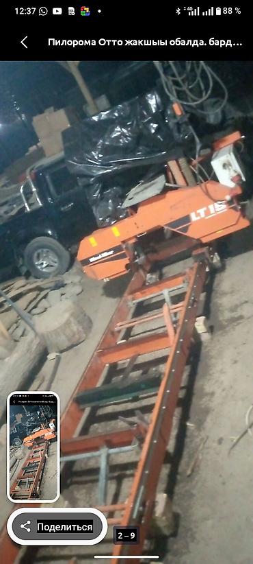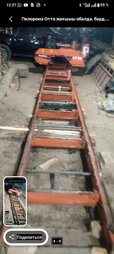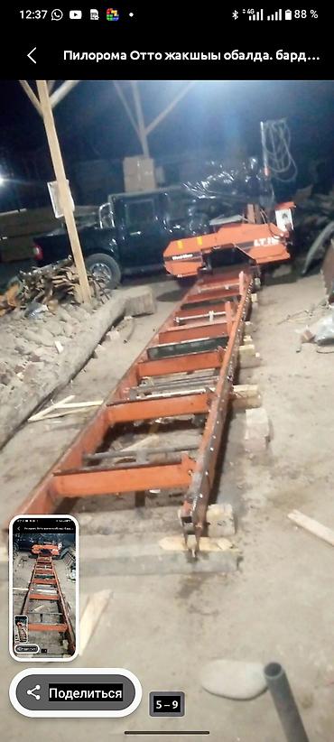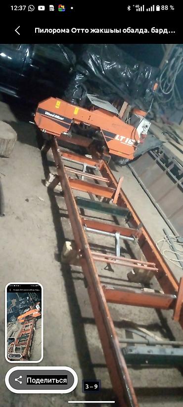 - Конструкция: жесткая рама, каретка с ленточной пилой, направляющие рельсы для подачи бревна