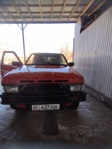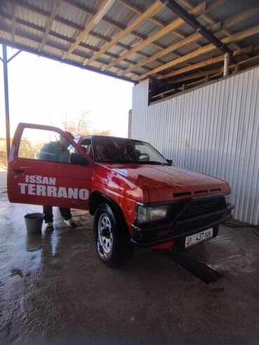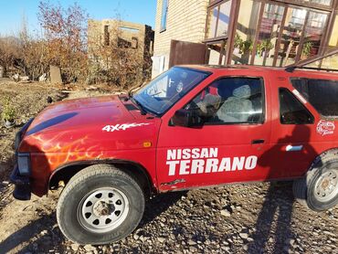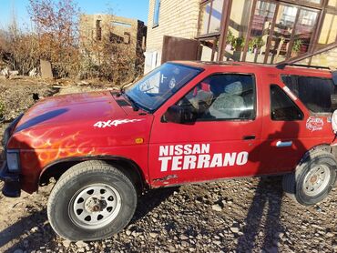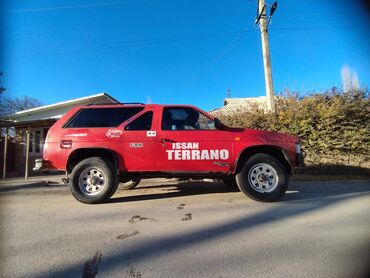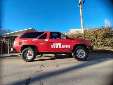 Внедорожник Nissan Terrano (3‑дверный кузов). Красный цвет, тематические наклейки на бортах. Полный привод 4x4, повышенный клиренс. Передний силовой обвес/кенгурятник, задний фаркоп. Легкосплавные диски, внедорожные шины. Тонированные задние стекла. Дверь багажника со стеклом, задние вертикальные фонари. Передний бампер с дополнительной защитой, боковые зеркала в черном цвете. Номерной знак Кыргызстана виден на фото. Подходит для бездорожья и активного отдыха, просторный багажный отсек, две двери и багажная дверь.