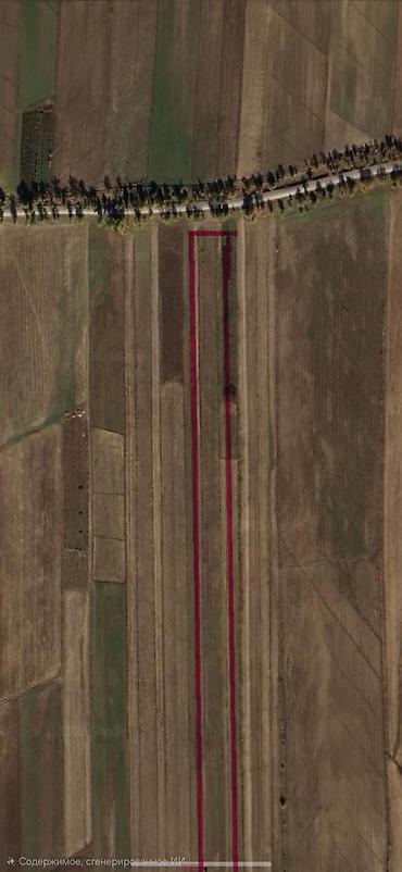 - Рельеф и покрытие: ровная пашня без видимых перепадов; длинная узкая полоса удобна для капельного орошения и линейной посадки культур.