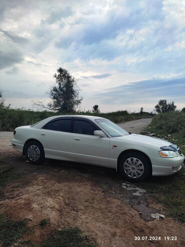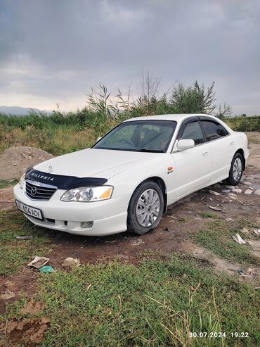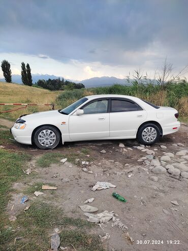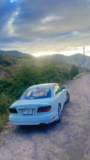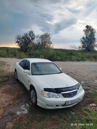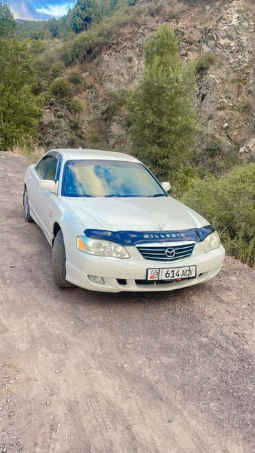 Mazda Millenia, седан бизнес‑класса, правый руль. Белый цвет, 4 двери, легкосплавные диски, тонированные стекла. На капоте защитный дефлектор с надписью Millenia. Передняя оптика с раздельными секциями, противотуманки в бампере. Задние фонари затемнённые, фирменные шильдики Millenia и 2.5 на крышке багажника. Боковые повторители поворотов на крыльях, зеркала и ручки в цвет кузова. Штатная решётка радиатора с эмблемой Mazda, хромированные элементы, аккуратные молдинги по периметру. Номерные знаки Кыргызстан.