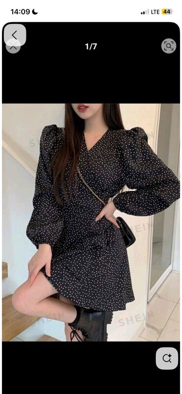Женская одежда — три позиции: 1) Черное платье в белый горошек: - Длина миди - Запах/драпировка на лифе, V-образный вырез - Длинные однотонные рукава с манжетами - Приталенный крой с декоративным ...