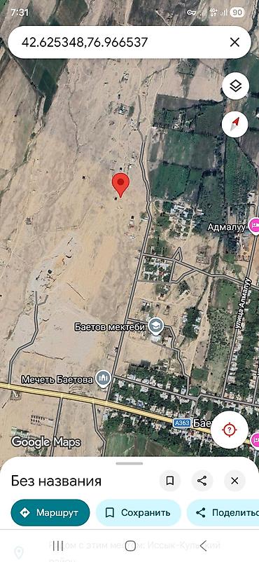 - Местоположение: с. Баетово, Иссык-Кульский район (координаты: 42.625348, 76.966537). Участок в жилой зоне рядом с улицей Алмалу, в пешей доступности школа «Баетов мектеби» и мечеть.