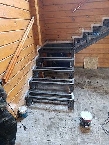 Сварщик, лестница, навес. Металлический каркас маршевой лестницы под облицовку - Прочный сварной каркас из стальных профилей для прямого марша. - Конструкция закрытого типа: ступени устанавливаютс...