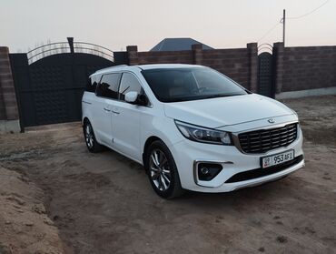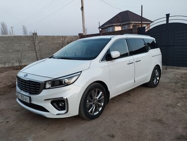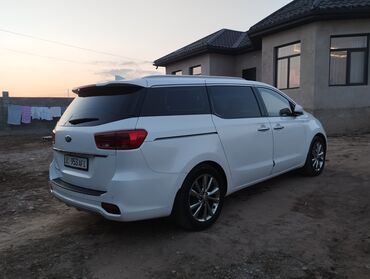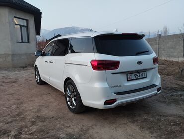 Kia (белый цвет), кузов — минивэн/кроссвэн. Современная фирменная решётка радиатора, светодиодная оптика с ДХО, противотуманные фары в бамперах. Кузов с рейлингами на крыше, широкий лобовой проём для хорошей обзорности. Просторный салон со светлой отделкой, большое лобовое стекло и высокий капот. Передний парктроник/датчики в бампере, камера/датчик в основании зеркала для систем помощи водителю. Номерные знаки KG.