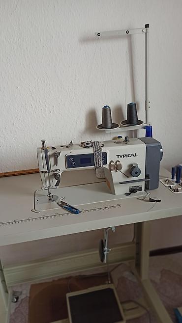 Промышленная швейная машина Typical, представленная на прочном рабочем столе. Машина оснащена держателями для двух катушек ниток, что позволяет использовать ее для различных швейных задач. Интегрированный дисплей обеспечивает удобное управление настройками. Педаль ножного управления обеспечивает точность и контроль во время работы. Идеально подходит для профессионального использования в ателье или на производстве.