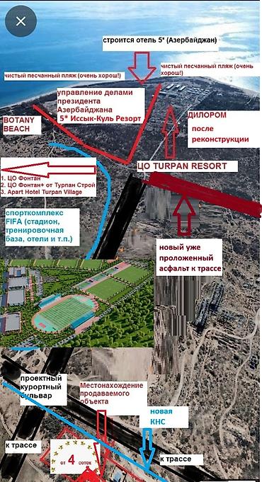 📈 Район активно развивается: новые 5★ отели (Turpan Resort, 5★ отель от управделами президента Азербайджана Иссык-Куль Резорт с обширной инфраструктурой для отдыха, Turpan Village, Seven Sunny Days, Фонтан+, Turpan Forte и многие др.), горячие источники, через дорогу будущий международный спорткомплекс FIFA на 17га (строительство уже начинается).