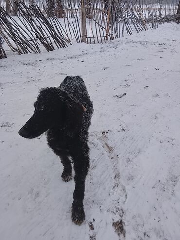 Черная собака среднего роста с длинной волнистой шерстью и опущенными ушами. Стройное, поджарое телосложение, длинные ноги, изящная вытянутая морда. Хвост средней длины с легким завитком на конце. На шее — ошейник.