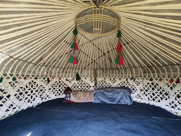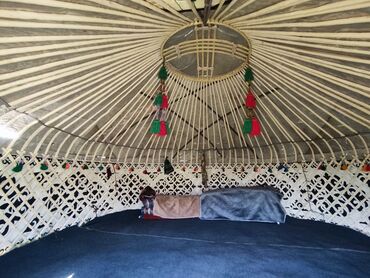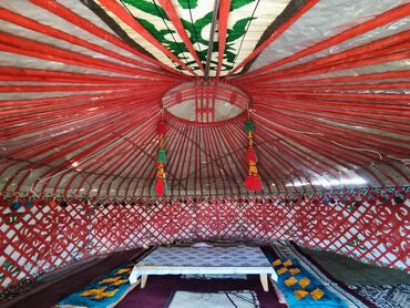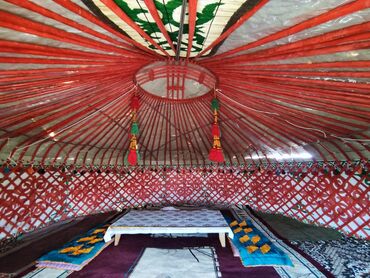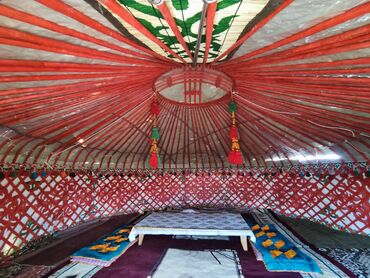 Юрта с красной внутренней отделкой и бамбуковым каркасом. Внутри установлена низкая платформа, украшенная текстилем с узорами. Стены и потолок юрты декорированы традиционными орнаментами. Идеально подходит для создания аутентичного пространства для отдыха или проведения мероприятий.Особенности:
