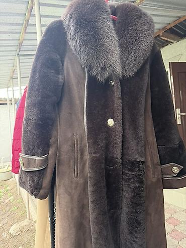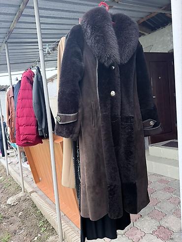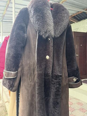 Длинная женская дубленка из натуральной овчины, темно‑коричневого цвета.