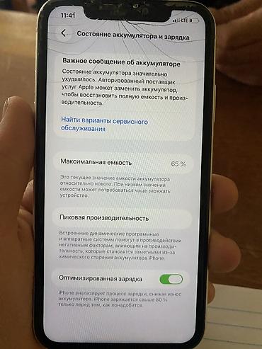 - Батарея: максимальная емкость 65%; в разделе состояния аккумулятора отображается важное сообщение о необходимости обслуживания.