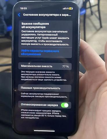 Состояние аккумулятора по настройкам: максимальная емкость 77%, отображается предупреждение о необходимости замены для восстановления полной емкости и производительности.