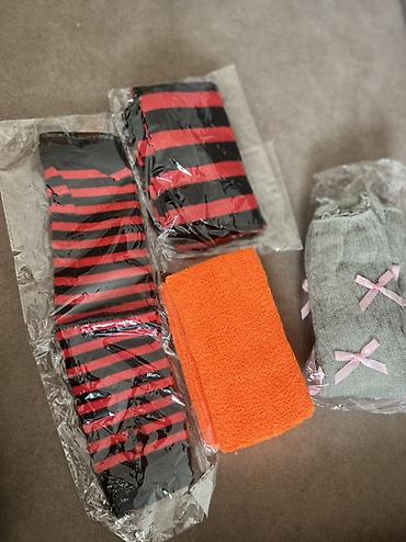 - Чулки/гольфы в красно‑чёрную полоску — 2 пары (высокие, эластичные).