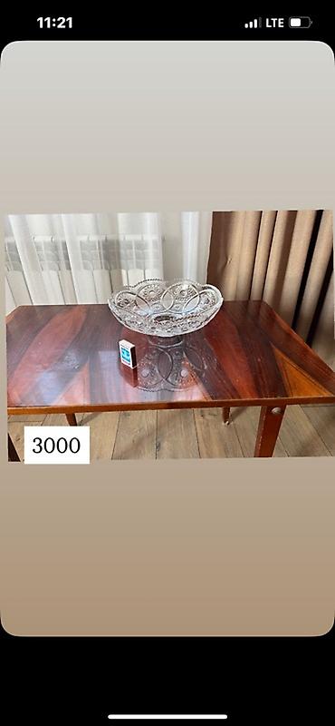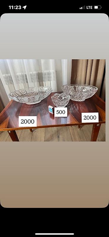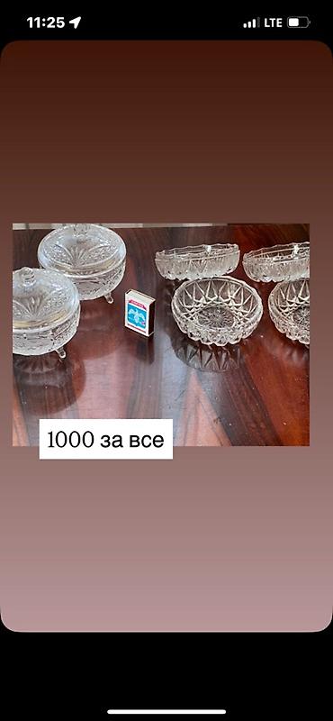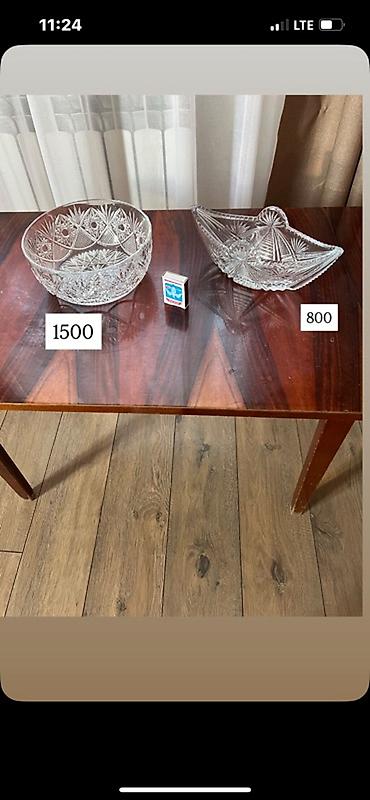 - Хрустальная салатница среднего размера (рядом со спичечным коробком для масштаба), округлая форма с гравировкой. Цена на фото: 3000.
