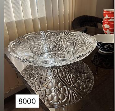 1) Большое прессованное/гранёное хрустальное блюдо с богатой резьбой (звезды, rosettes, лепестки). Диаметр крупный, широкие борта с зубчатыми краями. Цена: 8000.