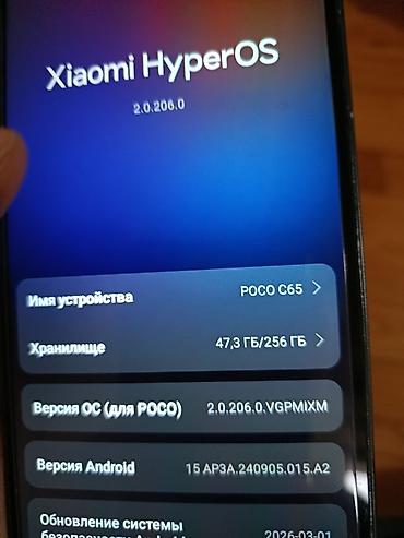 POCO C65 — смартфон на Xiaomi HyperOS 2.0.205.0 (для POCO), Android 15 (сентябрь 2024 сборка). Обновления безопасности Android до 2025‑12‑01. Основные характеристики: - Память: 256 ГБ встроенной, ...