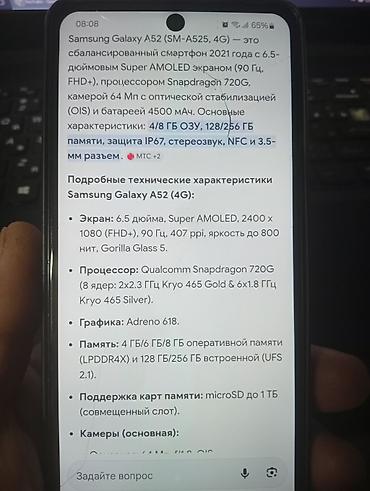 Samsung Galaxy A52 (черный) - Экран: 6.5" Super AMOLED, 1080×2400, фронтальная камера в отверстии по центру. - Процессор: Qualcomm Snapdragon 720G. - Камеры: четыре задние — 64 МП + 12 МП (ультраш...