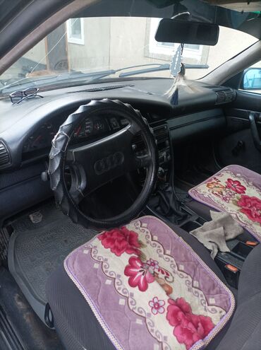 - Салон: тёмный интерьер, передние сиденья с накидками, трёхспицевый руль Audi, центральная консоль с штатной магнитолой/блоком управления, коврики.