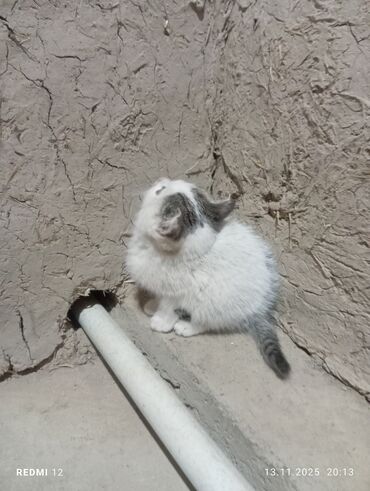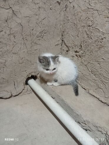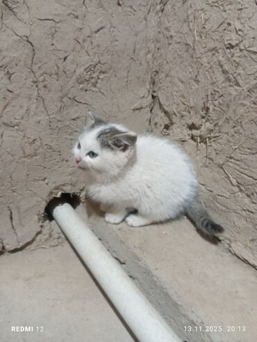 Котёнок домашний, короткошёрстный. Окрас: белый с серыми пятнами на голове и хвосте, хвост полосатый. Глаза голубые. Компактный, пушистый, с округлой мордочкой и небольшими ушками. Возраст визуально небольшой (малыш).