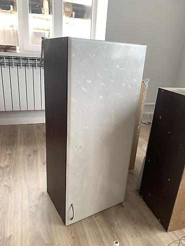 - Отдельный высокий навесной/напольный модуль светлого цвета.