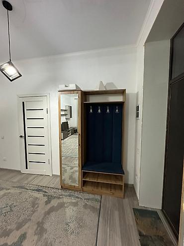 - Отделка и оснащение: современные светильники, ламинат, потолочные светильники-кубы, плотные портьеры, зеркальный шкаф в прихожей.