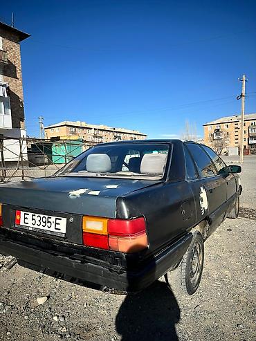 Audi 100 (C3), седан, черный цвет. Классический полноразмерный кузов с просторным салоном и большим багажником. Интерьер: тканевые сиденья, передние электрические стеклоподъемники, регулировка зеркал, центральная консоль с нишами для мелочей, классическая панель приборов с деревянными вставками. Руль с эмблемой Audi, механическая коробка передач, ручной стояночный тормоз.