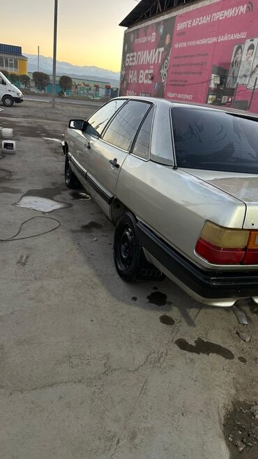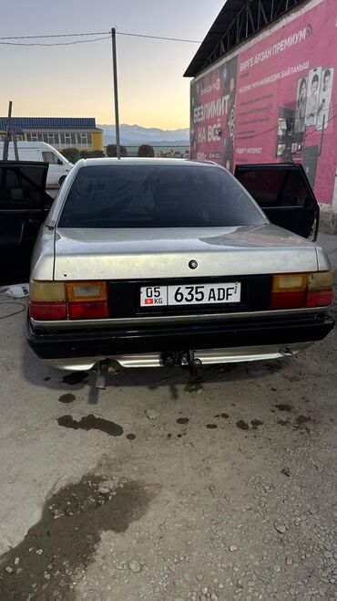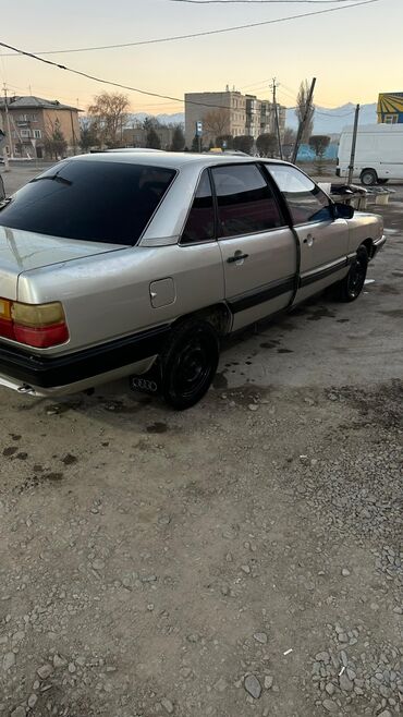 . Audi 100 C3 седан, серебристый кузов с черными бамперами и молдингами. Кузов 4‑дверный, тонировка по кругу. Передняя оптика прямоугольная, фирменная решетка с эмблемой Audi. Задние фонари раздельные, установлен фаркоп. Черные штампованные диски, брызговики с логотипом Audi. Передние и задние стеклоподъемники, зеркала в черном исполнении. Номерной знак KG на автомобиле. Комплектация с тканевым салоном (видны подголовники), центральный замок, обогрев заднего стекла. Отличается просторным багажником и классическим дизайном C3. Подойдет для повседневных поездок и перевозки багажа, фаркоп удобен для прицепа.