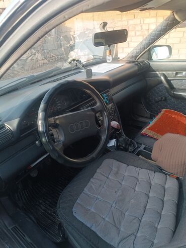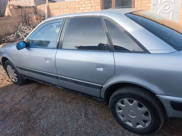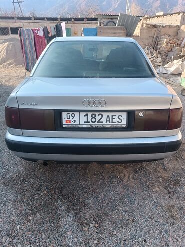 Audi 100 C4 седан, серебристый цвет кузова. Киргизская регистрация (номер 182 AES). Кузов 4-дверный, классический дизайн C4, оригинальные колпаки на стальных дисках. Тонированные стекла по кругу, черные молдинги по периметру, фирменная решетка радиатора с эмблемой Audi. Задняя оптика затемненная, одинарный выхлоп. Зеркала и ручки дверей в цвет темного пластика, имеются молдинги на дверях и бамперах.