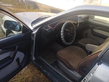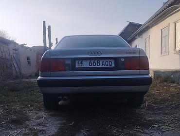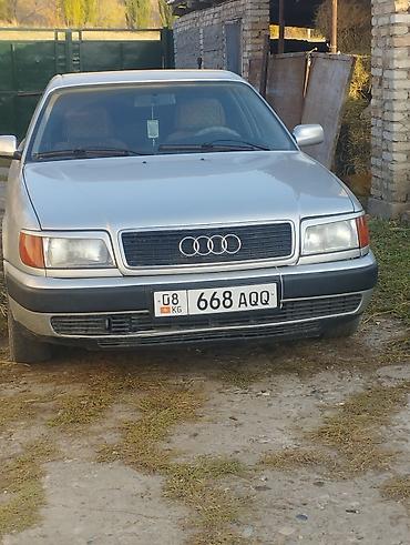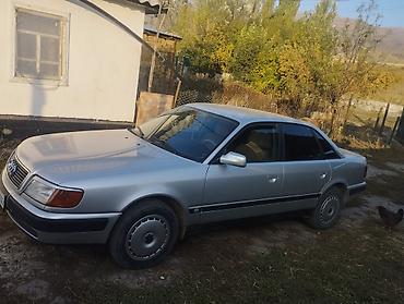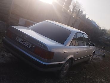 Audi 100 C4 седан, серебристый цвет, 4 двери. Классический кузов с фирменной решеткой и эмблемой Audi, стальные диски с колпаками, тонированные задние стекла, черные молдинги по периметру.