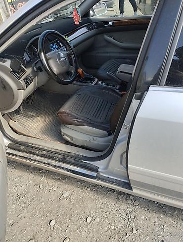 Audi A6 C5 седан, серебристый цвет кузова. Просторный салон в светло-сером тоне с вставками под дерево, передние сиденья с чехлами, задний диван цельный. Комбинация отделки: ткань/эко-кожа, передний подлокотник, карманы в дверях. Рулевое колесо с накладкой под карбон, приборная панель с классическими аналоговыми шкалами. Центральная консоль с МКПП, ручной тормоз, климат-блок, штатная магнитола, розетка 12V, дефлекторы для заднего ряда.
