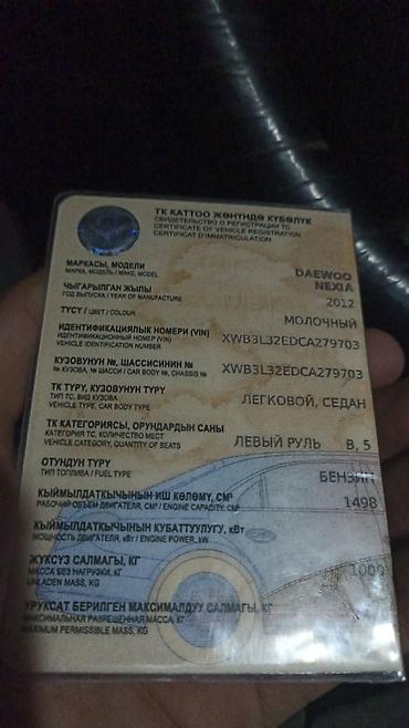 Daewoo Nexia, 2012 год выпуска. Кузов: седан, левый руль. печка Ташкент 4 зима шины,мафон пионер тонировка люмар Цвет: молочный. Топливо: бензин. Рабочий объем двигателя: 1498 см³. Мощность: 1000 кг масса без нагрузки указана в СТС (жёстко печатью; см. фото). VIN: XWB3L3ZEDCA279703 (совпадает с номером кузова/шасси в СТС).