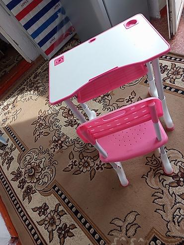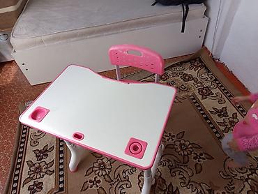 - Материал: пластиковая столешница с бортиком и вставками, пластиковый стул на металлических ножках.