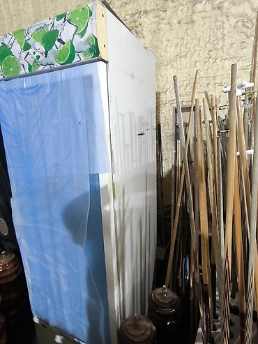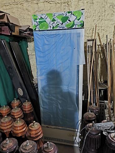 - Вертикальный однодверный шкаф с прозрачной дверью (снаружи закрыта светло‑синим экраном/занавесом).