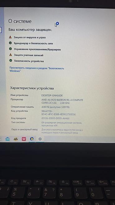Подходит для учебы, работы с документами, интернет‑серфинга и мультимедиа. На экране «О системе» отображается: защита Windows активна. На корпусе маркировка AMD A4.