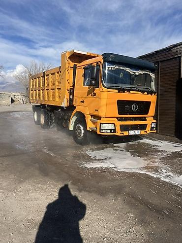 Самосвал тяжелого класса, оранжевый, колесная формула 6×4. Прочная стальная платформа с высокими бортами и задней разгрузкой, гидроподъем кузова. Односкатная/двускатная ошиновка на задней тележке, рессорная подвеска, мощный передний и задний бамперы. Кабина с широкой обзорностью, солнцезащитный козырек, наружные зеркала с дополнительными секциями. Передние противотуманные фары, лестница и подножки для удобного доступа. Подходит для перевозки сыпучих материалов (щебень, песок, грунт), строительных и демоотходов, для карьеров и стройплощадок. Отлично справляется с работами на бездорожье и в городских условиях.