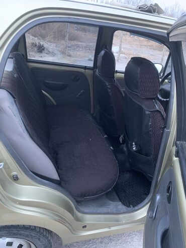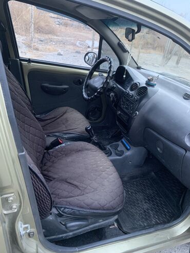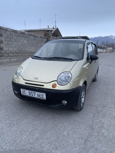 Daewoo Matiz, хэтчбек 5 дверей, золотистый цвет с черными бамперами. Компактный городской автомобиль с экономичным бензиновым двигателем и передним приводом. Кузов: округлая оптика спереди, противотуманные фары в переднем бампере, задние фонари вертикального типа. На фото видны ветровики на окнах, стальные диски, полноразмерная пятая дверь багажника. Салон рассчитан на 4–5 мест, высокая посадка, хорошая обзорность. Практичный для города: малые габариты, удобная парковка, низкий расход топлива. Номера KG. в комплекте мотор с коробкой и запчасти по ходовой и кузовной части.