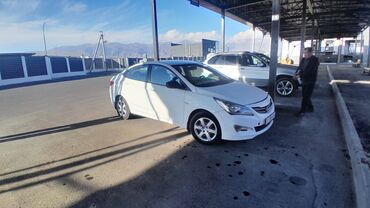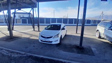 Hyundai Solaris седан, белый цвет. Поколение до рестайлинга с фирменной шестиугольной решеткой радиатора и узкой оптикой. Кузов и экстерьер: - 4‑дверный седан - Легкосплавные диски - Тонированные ...