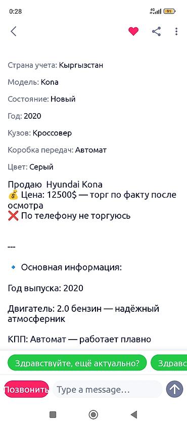🚗 Авто в рассрочку через банк! В продаже Хундай Кона Год выпуска: 2020 Топливо: дизель КПП: Автомат Объем: 1.6 Пробег: 200*** ✅ До 1 000 000 сом - без первоначального взноса ✅ От 1 000 000 сом — ...