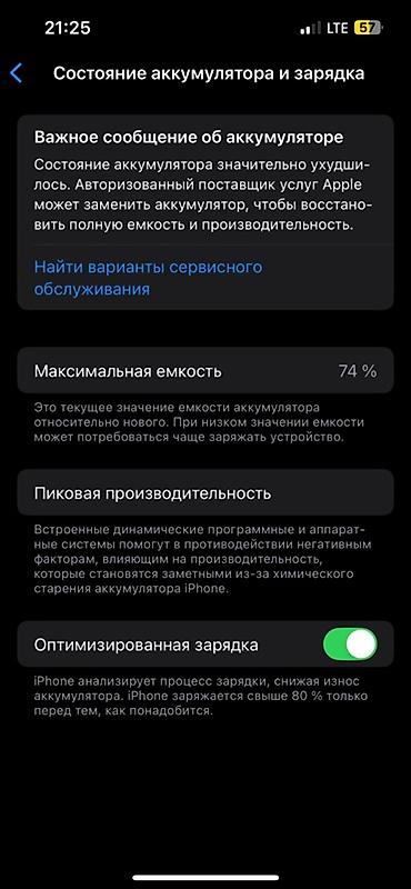 Дополнительно по состоянию аккумулятора (скриншот в галерее): максимальная ёмкость 74%, в разделе «Состояние аккумулятора и зарядка» отображается сообщение о необходимости сервисной замены для восстановления полной ёмкости и производительности.