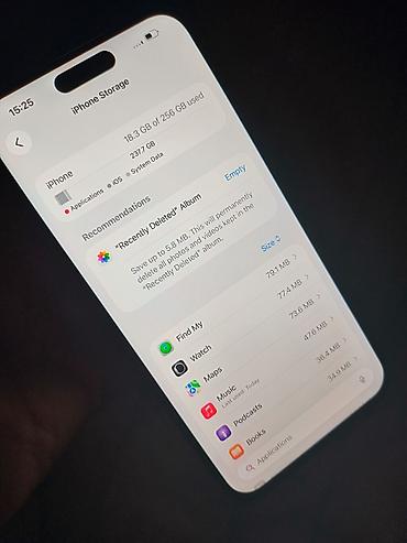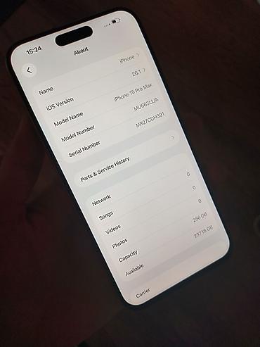 IPhone 15 Pro, 256 ГБ Характеристики и особенности: - Модель: iPhone 15 Pro (указано в настройках «Об этом устройстве») - Номер модели: MTUF3J/A - Память: 256 ГБ (доступно ~236,89 ГБ) - iOS: 16.3 ...