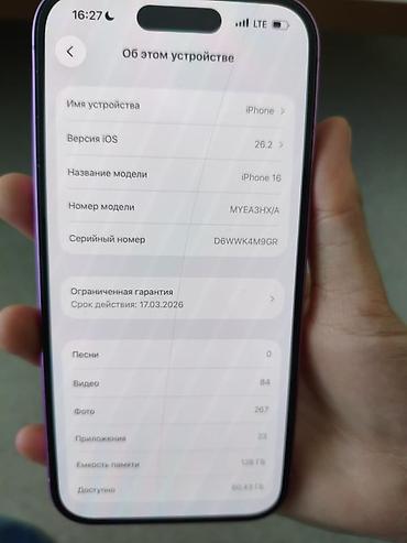 - В разделе «Об этом устройстве» отображается модель iPhone 16 (MYEA3HХ/A), серийный номер виден на скриншоте.