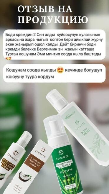 Также на изображениях представлена продукция Levante для лица и тела: очищающая пенка с алоэ вера и питательный крем Face & Body.
