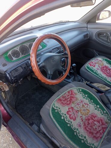 Mazda 626 седан, бордовый цвет. Кузов GD/GE поколения с обтекаемым дизайном, окраска металлик. Полноразмерный 5‑местный салон с тканевой отделкой, задний подлокотник. Передние и задние коврики, чехлы на сиденьях, оплётка руля. Центральная консоль с нишами и подстаканниками, аналоговая приборная панель. Механическая коробка передач, привод на передние колёса. Галогенные фары, противотуманные секции в переднем бампере. Задние фонари затемнённого стиля, спойлер на крышке багажника. Фаркоп. Колёсная база обеспечивает простор на втором ряду и большой багажник — удобен для поездок и перевозок.