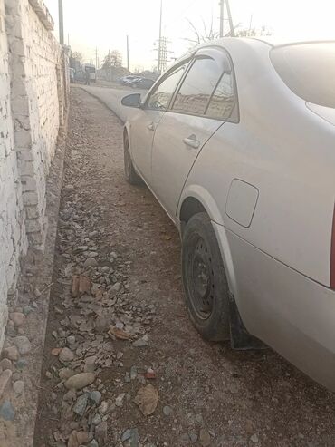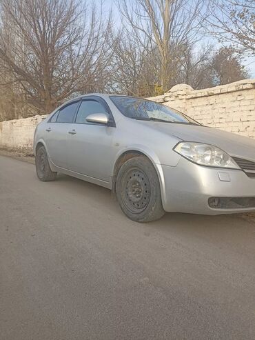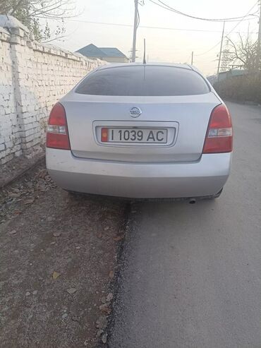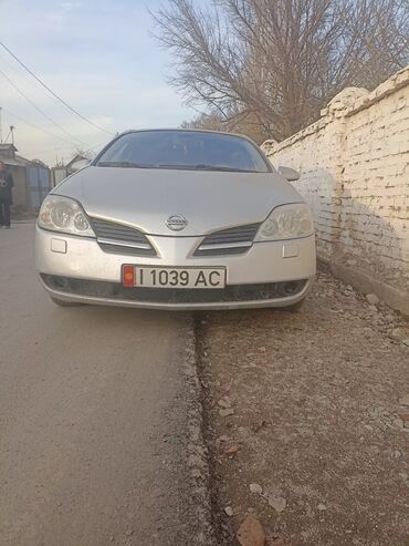 Nissan Primera седан, серебристый цвет, киргизская регистрация (номер на фото). Кузов P12, 4 двери, тонированные задние стекла и лобовая полоса. Галогенные фары, передние противотуманные огни, повторители в зеркалах.