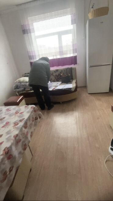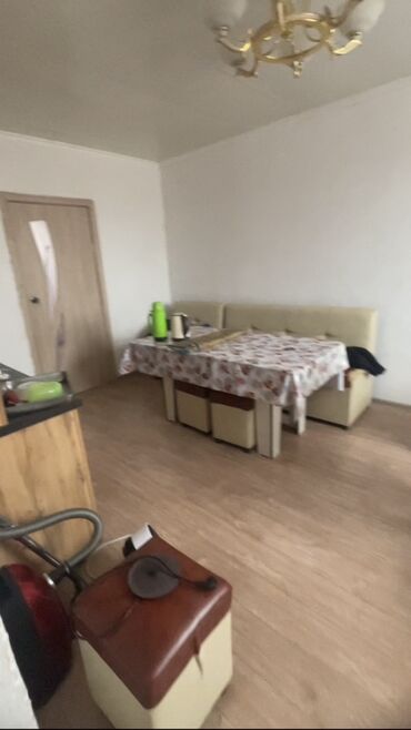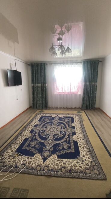 - Внутри: светлая гостинная с окном, потолочным светильником и настенным ТВ; кухня с газовой плитой и окном; просторная столовая/вторая комната с угловым диваном и столом.