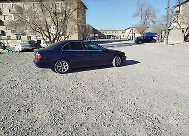BMW 5‑Series E39, седан, темно‑синий цвет. Классический дизайн с четырехдверным кузовом и фирменными “ангельскими глазками” в передней оптике. Легкосплавные 5‑спицевые диски, тонированные стекла, двойная выхлопная труба. Аккуратный салонный силуэт, ровные зазоры по кузову, аккуратно подогнанные бамперы, хром‑окантовка стекол. Задние фонари с оранжевыми секциями поворотников, штатные эмблемы и накладки. Номерные знаки на автомобиле установлены.