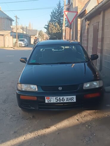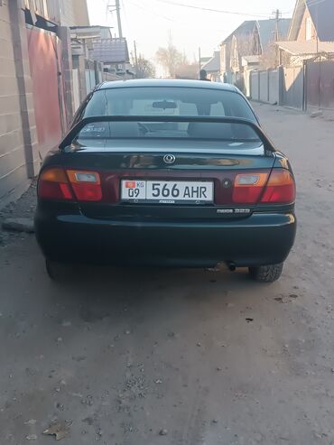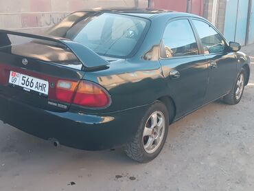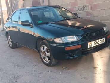 Mazda 323 седан (около середины 1990‑х), темно‑зеленый цвет, 4 двери.