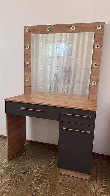 - Туалетный стол с большим зеркалом и подсветкой по периметру (гнёзда под лампы по типу «голливудской»), широкая столешница, 3 выдвижных ящика, длинные металлические ручки в золотистом цвете.