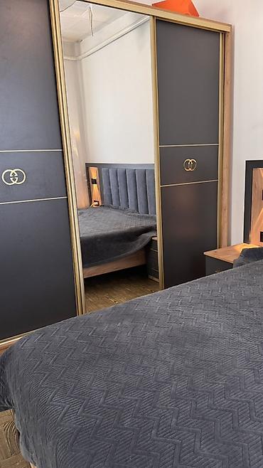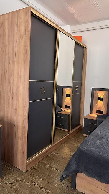 - Шкаф-купе с тремя дверями: центральная дверь-зеркало во весь рост, боковые двери — антрацит с золотистыми профилями и декоративными эмблемами; корпус — под дуб.