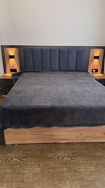 - Кровать двуспальная с мягким высоким изголовьем, вертикальная стёжка велюра. Основание под матрас с декоративными вставками «под дуб».